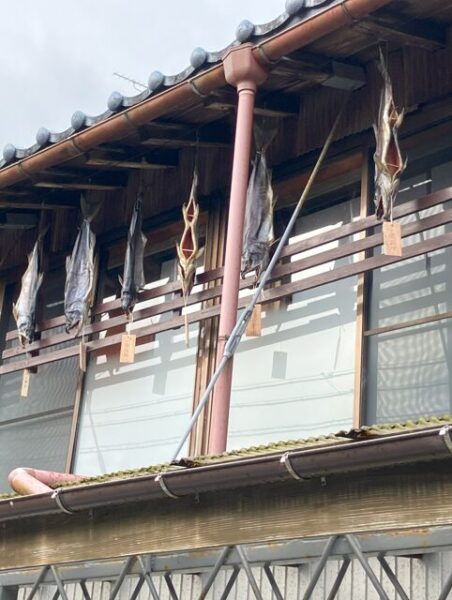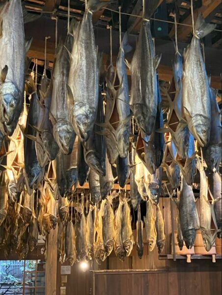 秋から冬になると日本海から吹き込む寒風にさらして熟成させる塩引き鮭が民家の軒先でもつるされています。