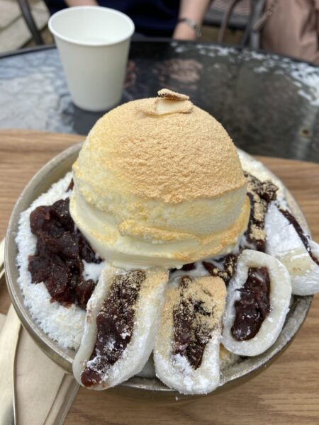 慶州に日帰りで行った際、天気が良く22℃、古民家カフェでピンス(アイス、お餅入り)をオーダーして休憩。甘く冷たく体力復活!