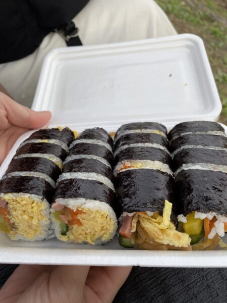 ファンニダンギルに入口にある「キョリキンパ」をテイクアウトしました。錦糸卵がびっちりで甘くないキンパ!
